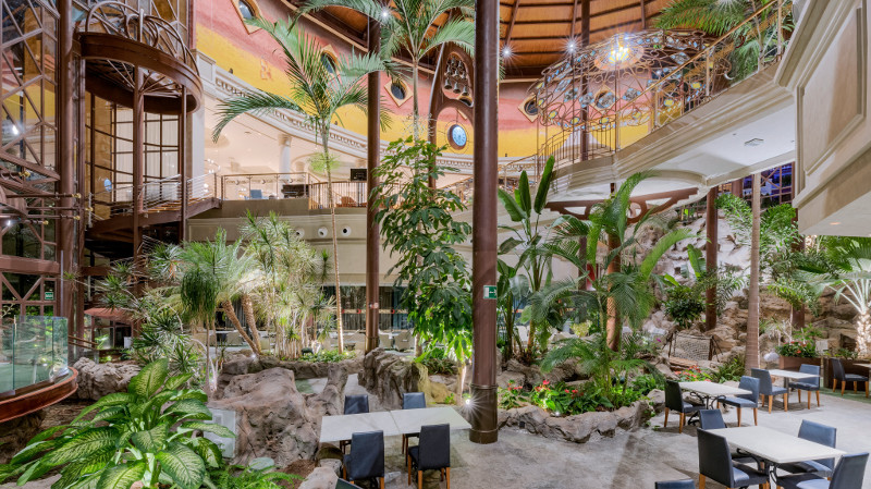 Entre las exóticas palmeras de uno de los jardines interiores del Hotel Cordial Playa se puede encontrar una luminaria de de la Serie Atria. Diseñada para ser colocada en altos techos, su gran potencia permite cubrir una gran cantidad de espacio. Además, el uso combinado de lentes específicas y reflectores aluminizados asegura un óptimo rendimiento en iluminación antipánico y rutas de evacuación.