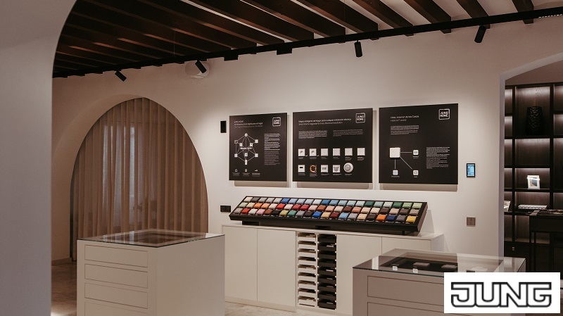 Al ingresar, se revelan diferentes áreas, cada una con su identidad única. En el corazón del showroom, se encuentra la exposición de modelos y acabados de mecanismos eléctricos de JUNG, destacando series como LS ZERO, LS 1912 y LS 990.